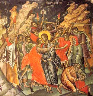 Για να περιορίσει λοιπόν τη παραφροσύνη του και για να δείξει πως αν δεν ήθελε, δεν θα προδιδόταν, άκουσε τι κάνει. Κατά την ώρα ακριβώς της προδοσίας, όταν ήρθαν εναντίον Του κρατώντας ξύλα, λαμπάδες και πυρσούς, τους λέει: «Ποιον ζητάτε;» και δεν γνώριζαν Εκείνον που επρόκειτο να συλλάβουν.